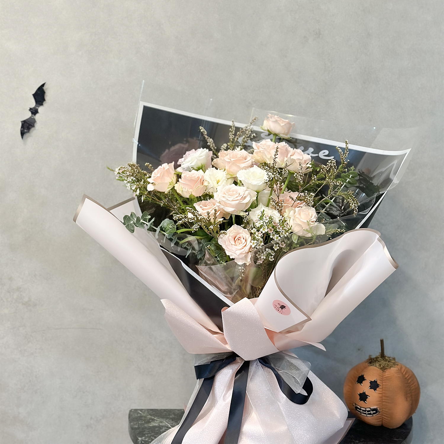 訂購 商品詳細資訊: 尺寸→ 約30cm(直徑) x 約50cm(高) 成分→ 玫瑰、臘梅、桔梗、史考梅、新鮮葉材、包裝紙、緞帶