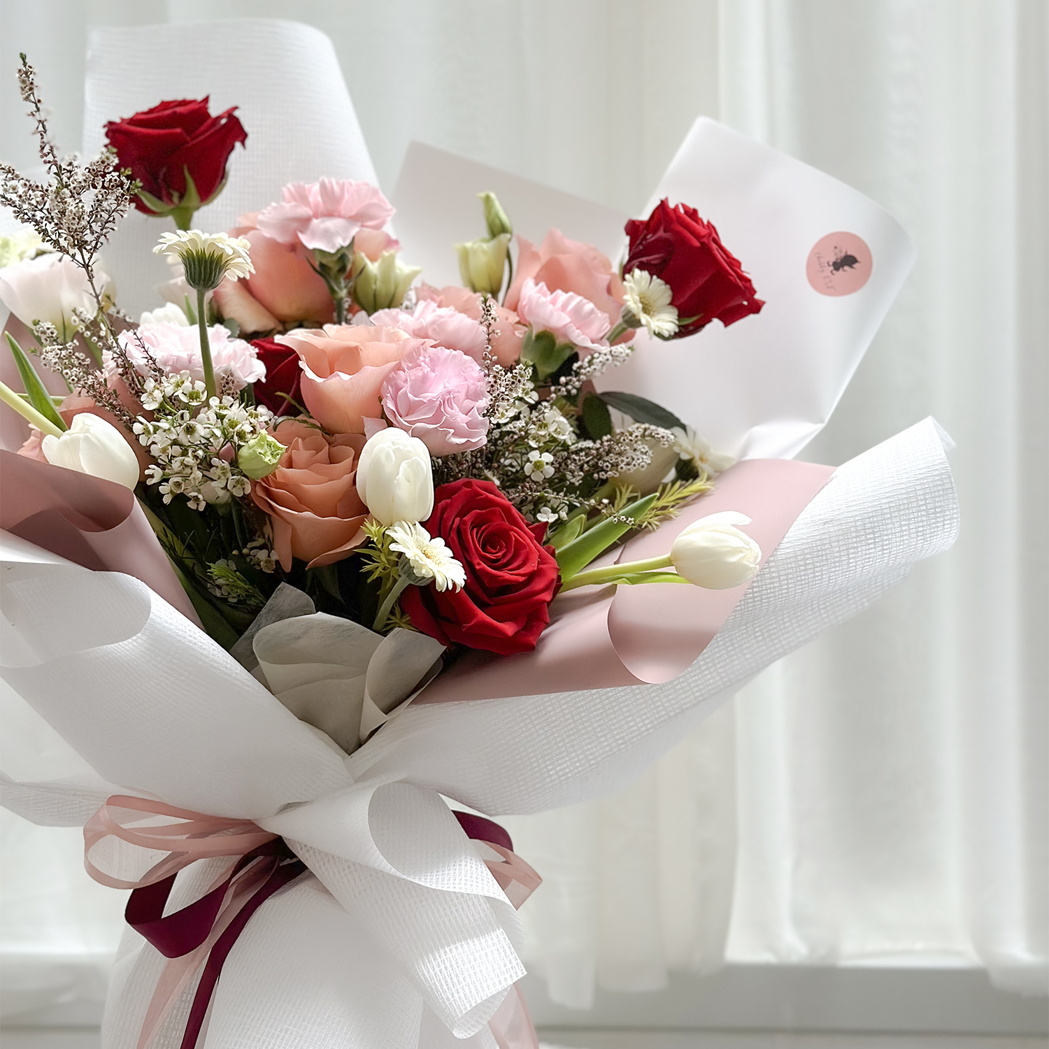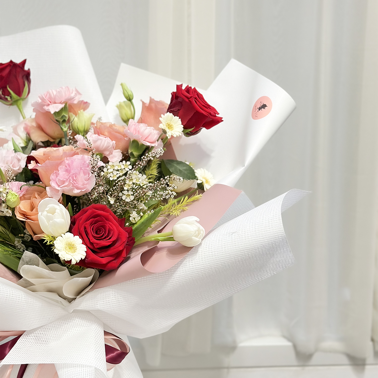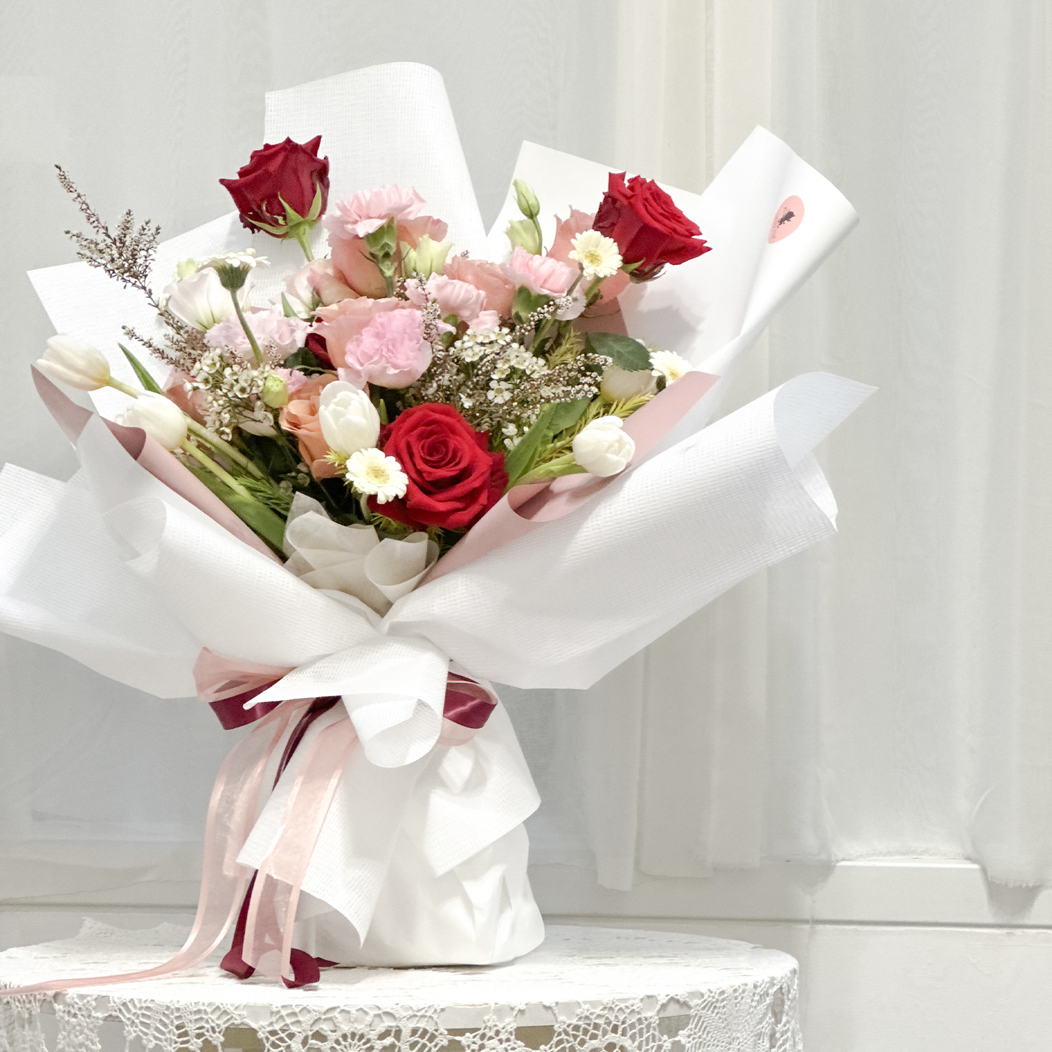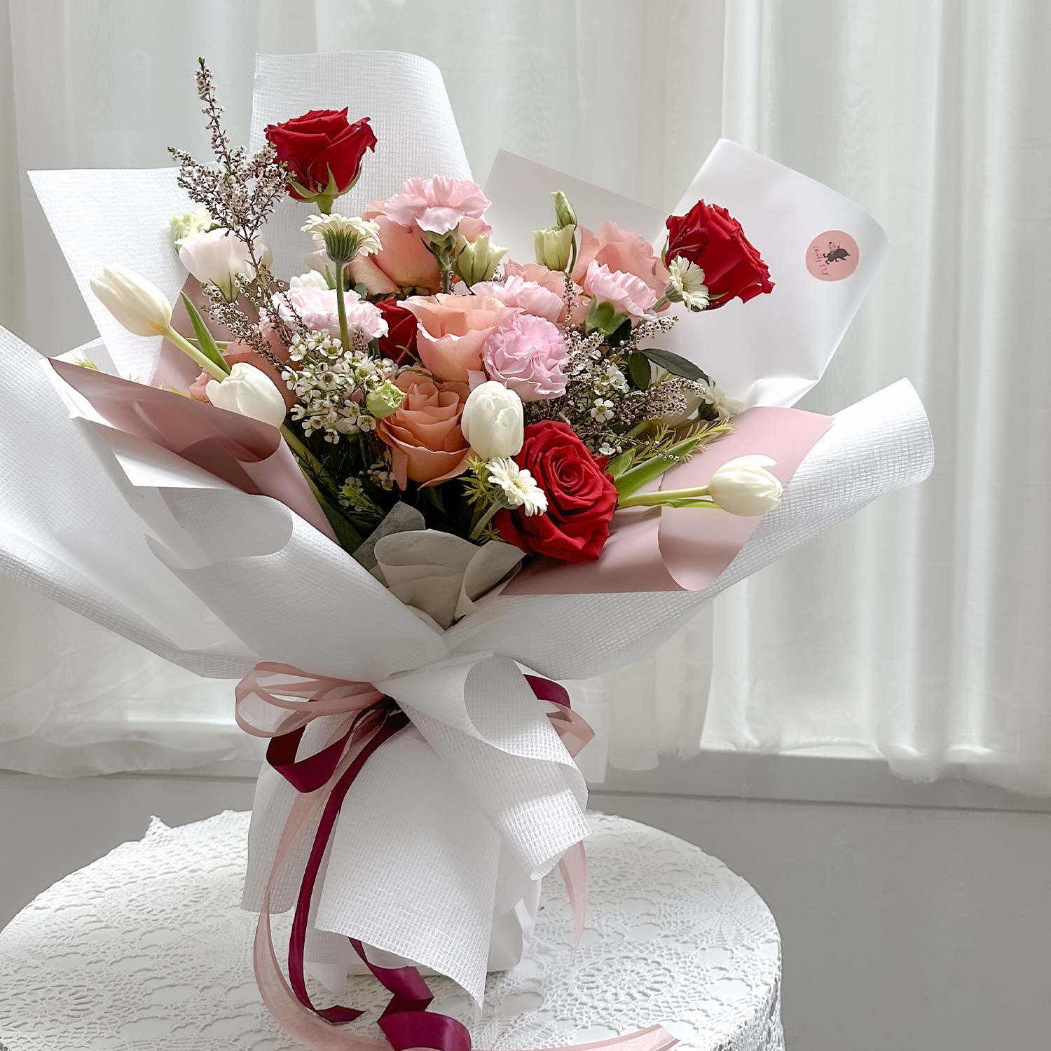 訂購 商品詳細資訊: 尺寸→ 約30cm(直徑) x 約50cm(高) 成分→ 玫瑰、綠石竹、尤加利葉、新鮮葉材、包裝紙、緞帶 對你的心