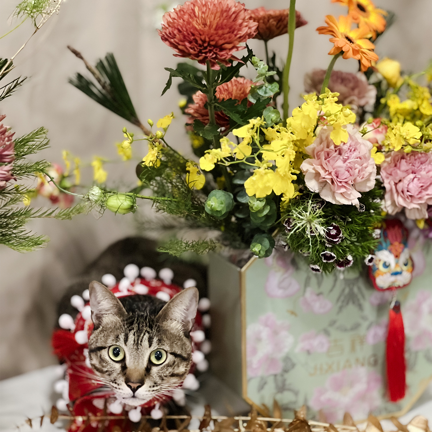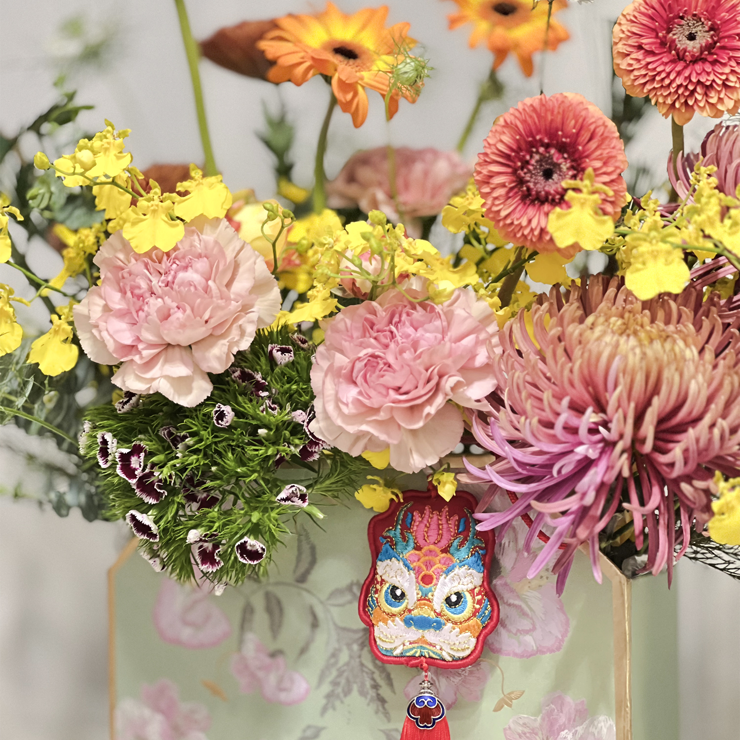 虎頭蘭、綠石竹、松蟲、玫瑰、富貴菊、陸蓮